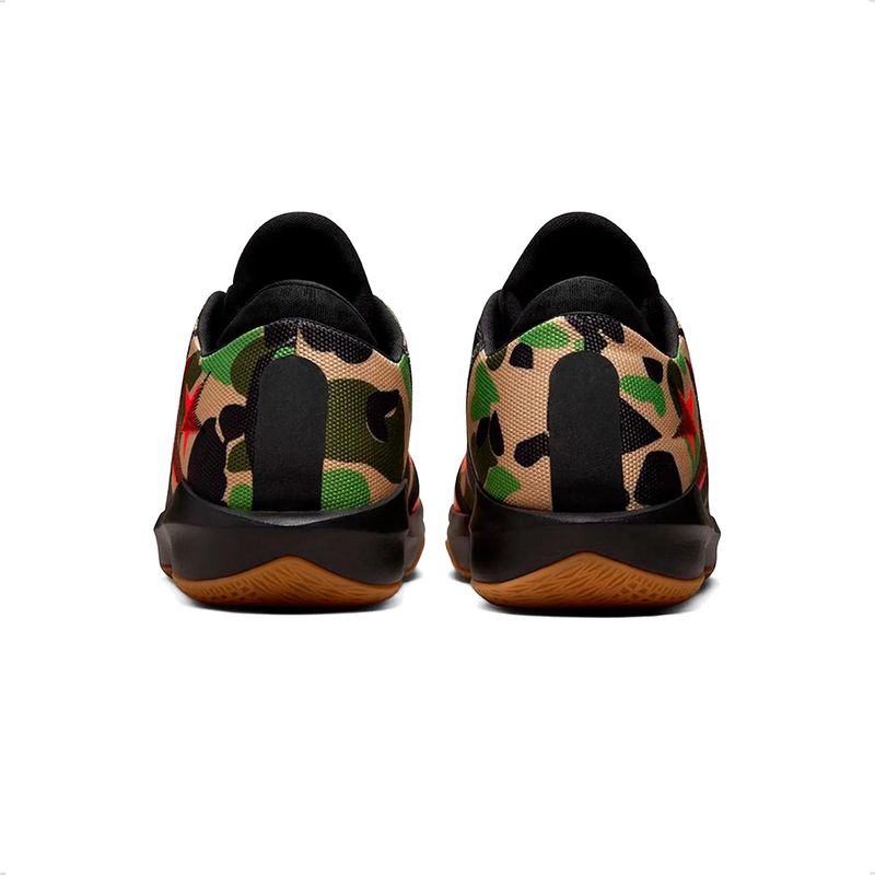 -Upper mixto de cuero, tejido técnico y materiales sintéticos, con patrón “camo” (camuflaje) en tonos oscuros y contrastes vibrantes.